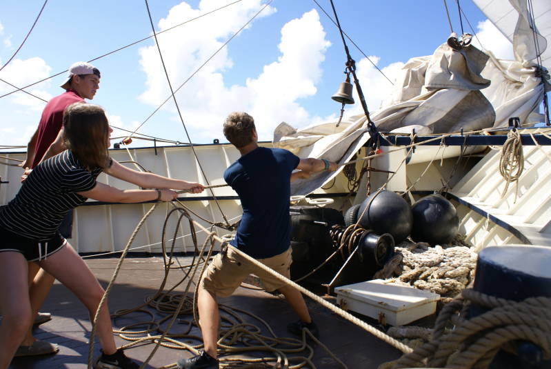 We worden ingedeeld in twee groepen. Om en om heb je een studie dag en een wachtdag. Taken die bij de wacht horen zijn het zeilen van het schip, het huishouden aan boord en allerlei verschillende klussen aan boord. Op zondag zijn we vrij van studie, maar niet van wacht; deze dag is de schoonmaak dag, daarna hebben we vrije tijd.