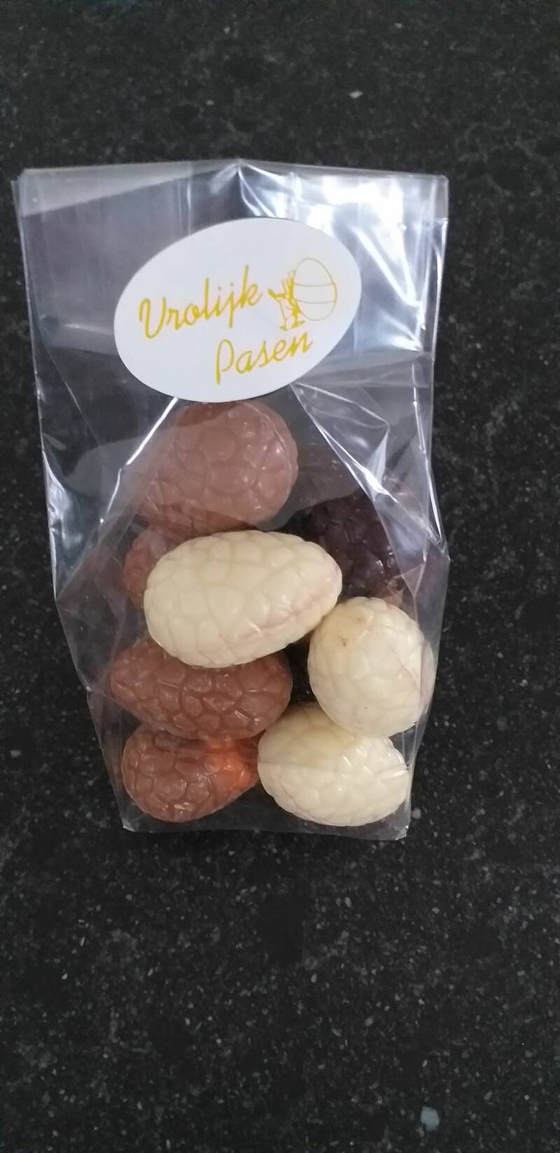 Wilt u ook uw medewerkers trakteren met Pasen op chocolade eitjes? Dat kan! Ik heb zakjes met grote chocolade eitjes van goede kwaliteit met een zachte roomvulling en u betaalt dezelfde prijs als bij de bakker. Prijs per zakje is 3,50 en de minimum afname is 15 zakjes.